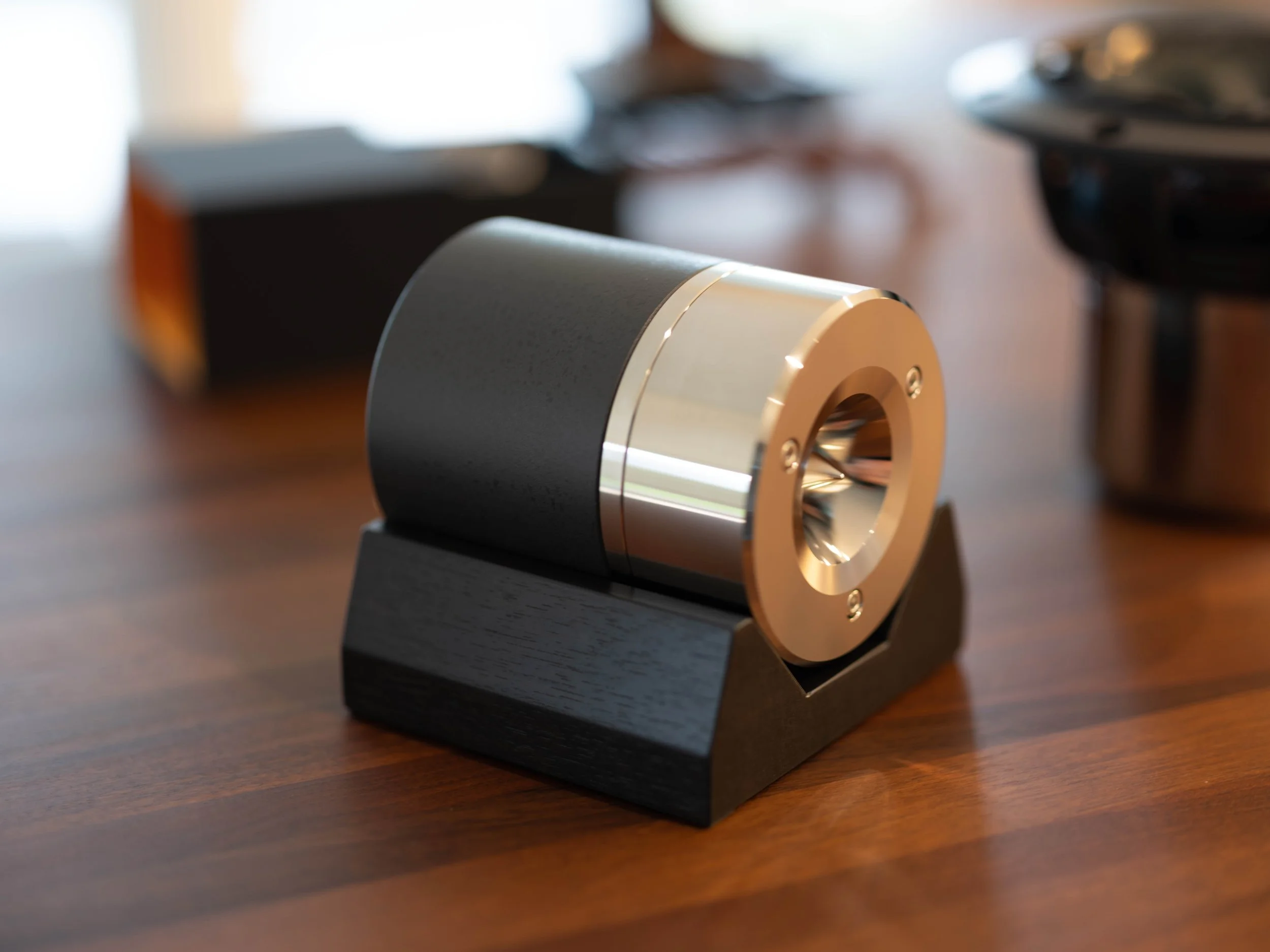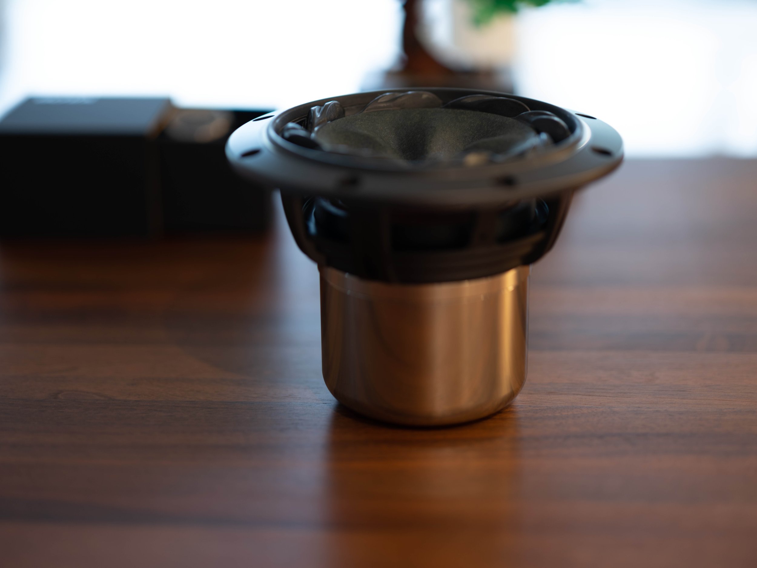 GEHÄUSE UND MATERIALISIERUNG: geschlossen, aus Titan (unlegiertes Titan, Grade 2) für den Monolith und Chromnickelstahl für die Resonanzhalbhohlkugel (beides innen mit viskoelastischer AMPACK IDIKELL M4001/05 Schwerfolie, 10 Kg/m2, ausgekleidet) mit Lederüberzug (Fine Scottish Leather) und Kontrastnähten, Beugungs- / Diffraktions-Filz in tetraedischer Geometrie um das Lautsprecher-Chassis